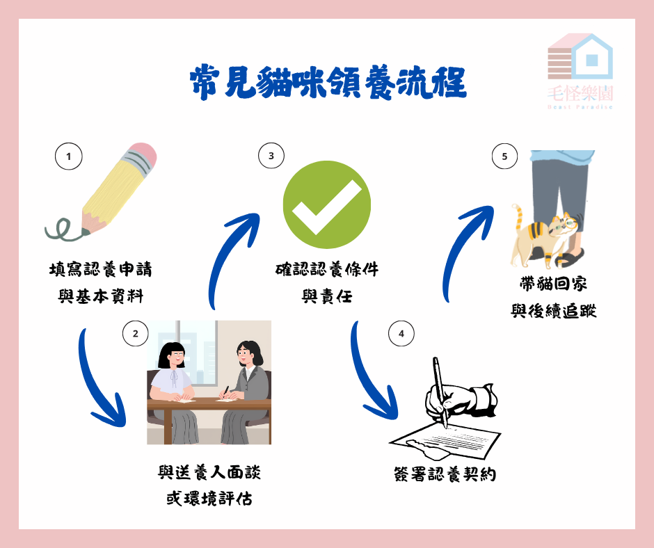 雙方達成共識後會簽署認養契約,內容通常包含飼養責任、不得轉讓、基本醫療與照顧義務等。部分單位也會保留聯絡方式以便後續追蹤,是雙方都確保貓咪未來生活品質的重要保障,也是飼主正式承諾負責的開始喔!