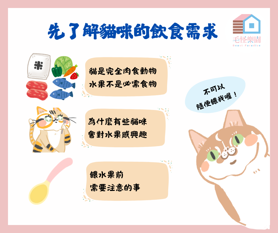 貓咪屬於肉食動物,身體主要依賴動物性蛋白質與脂肪來維持機能,對碳水化合物與糖分的需求較低。水果中的維生素與營養,大部分也能從主食中獲得,因此水果更接近「偶爾給的點心」,而不是日常飲食的一部分。
