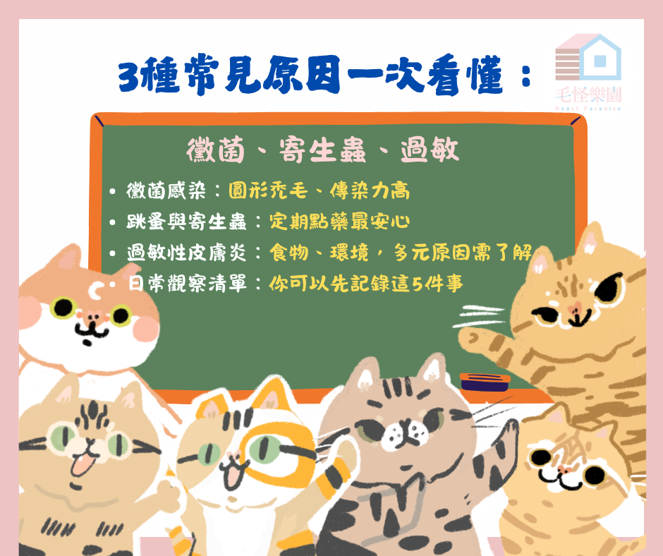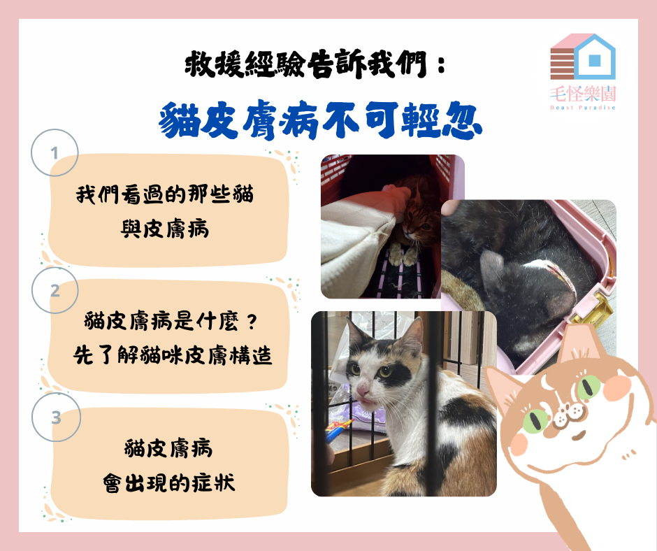 自毛怪樂園成立以來,我們一直努力在做動物救援,其中不乏將大量貓咪從髒亂環境救出的經驗,而這些貓咪身上有一個共通點,就是或多或少都帶有一些皮膚疾病。長期營養不良、壓力大、環境潮濕或寄生蟲感染,都是讓皮膚成為最先出問題的地方,我們看過許多貓身上有明顯的局部禿毛、結痂、甚至自己抓到流血,狀況令人無比心疼。