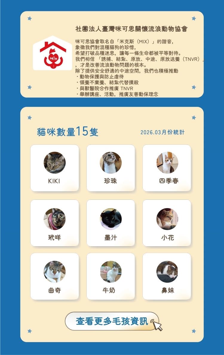 咪可思協會取名自「米克斯(MIX)」的諧音,象徵我們對混種貓狗的珍惜,希望打破品種迷思,讓每一條生命都被平等對待。