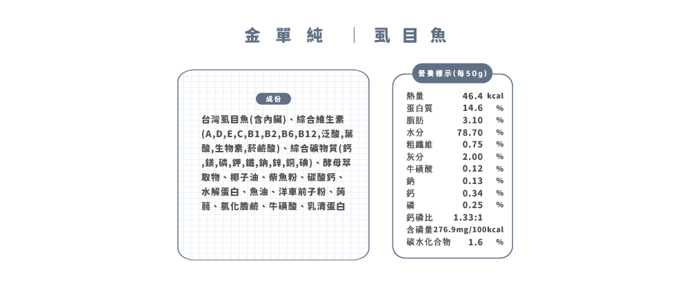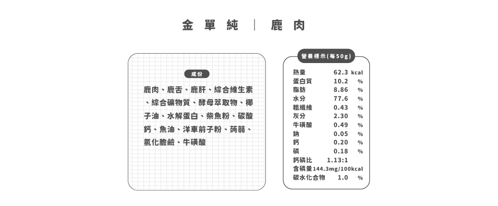 金單純餐包使用天然肉塊做原料,每一批肉類會因季節變化而有差異,營養成分因此有所不同。我們會依照最新的成分做更新,包裝袋顯示的就是當批次生產的成分,以實際包裝標示為主