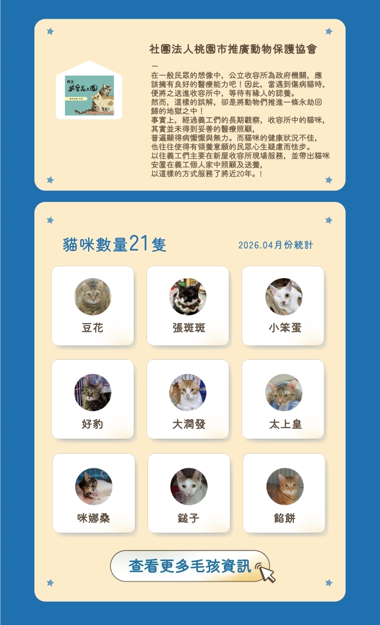 以往義工們主要在新屋收容所現場服務,並帶出貓咪安置在義工個人家中照顧及送養,以這樣的方式服務了將近20年。