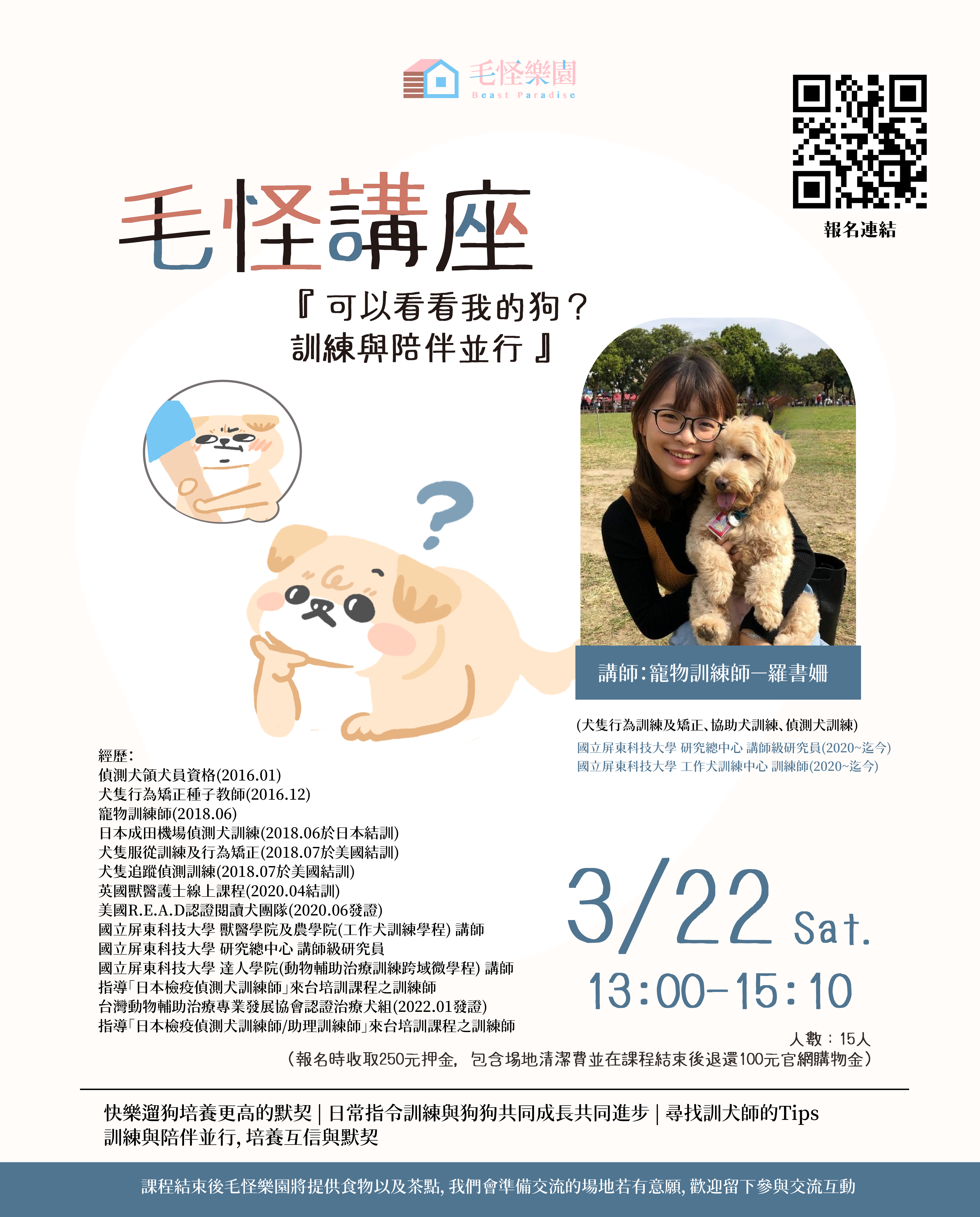 狗狗將協助講師進行示範,當天不接受攜帶任何寵物,請根據情況自行決定是否報名參加。