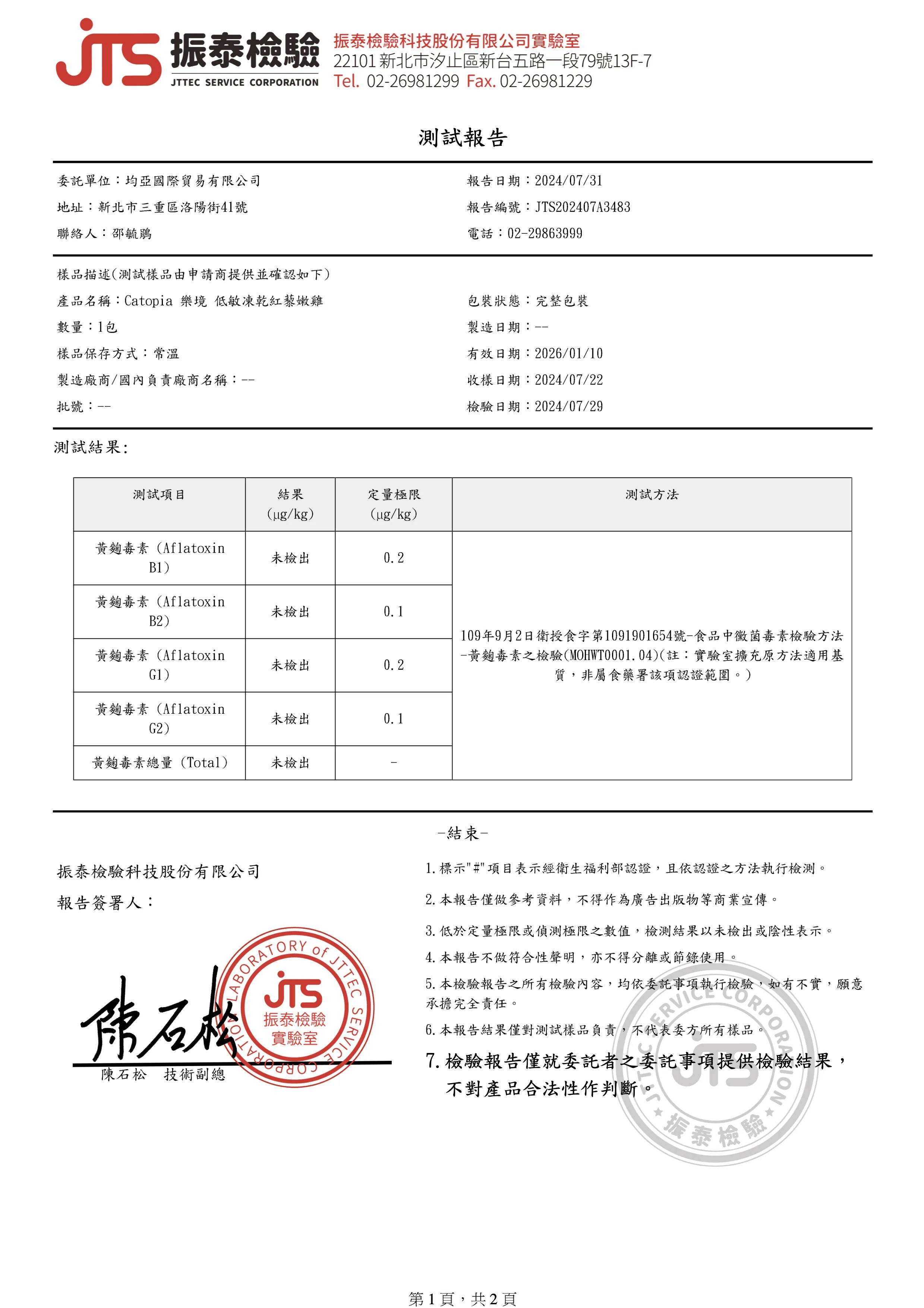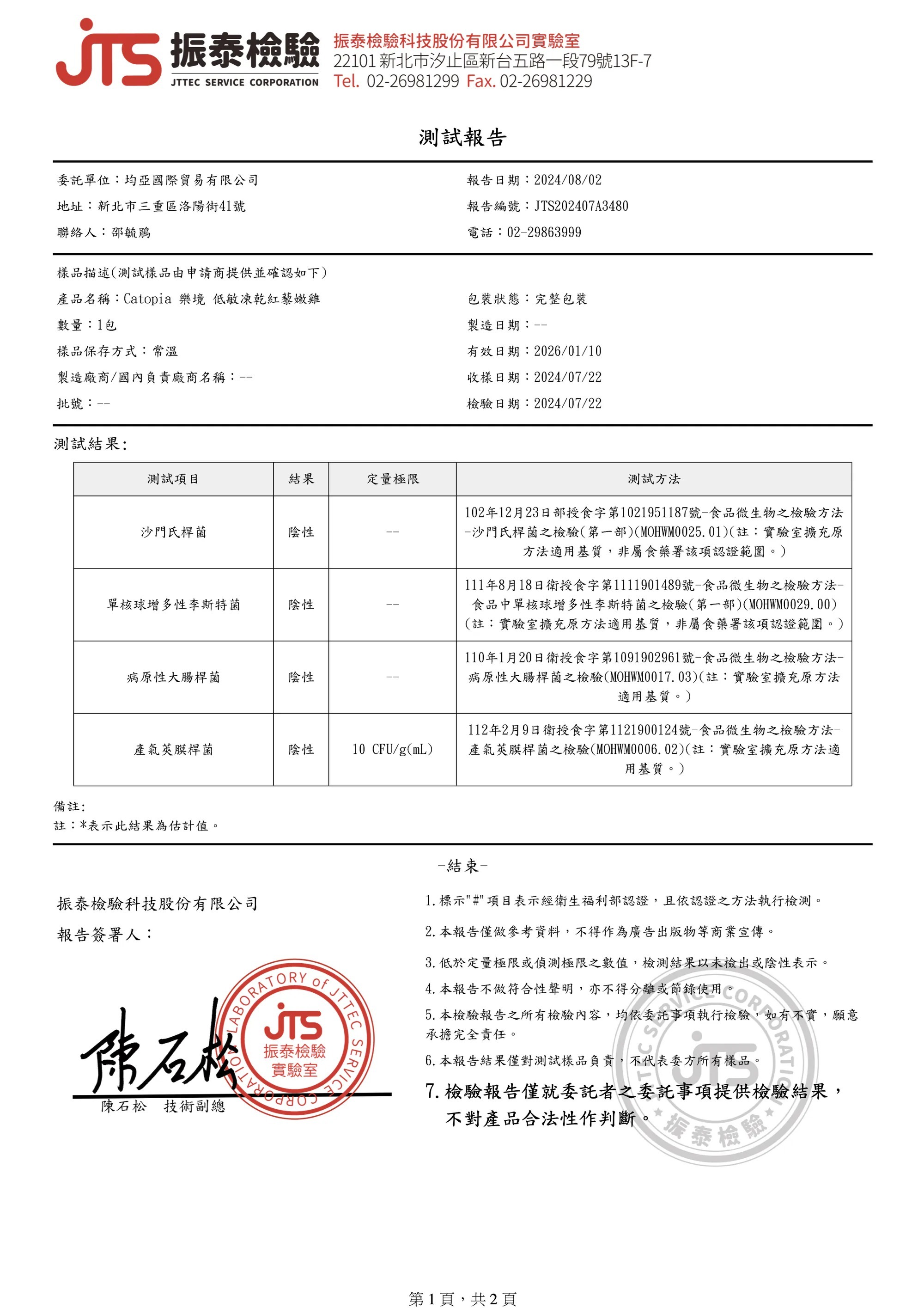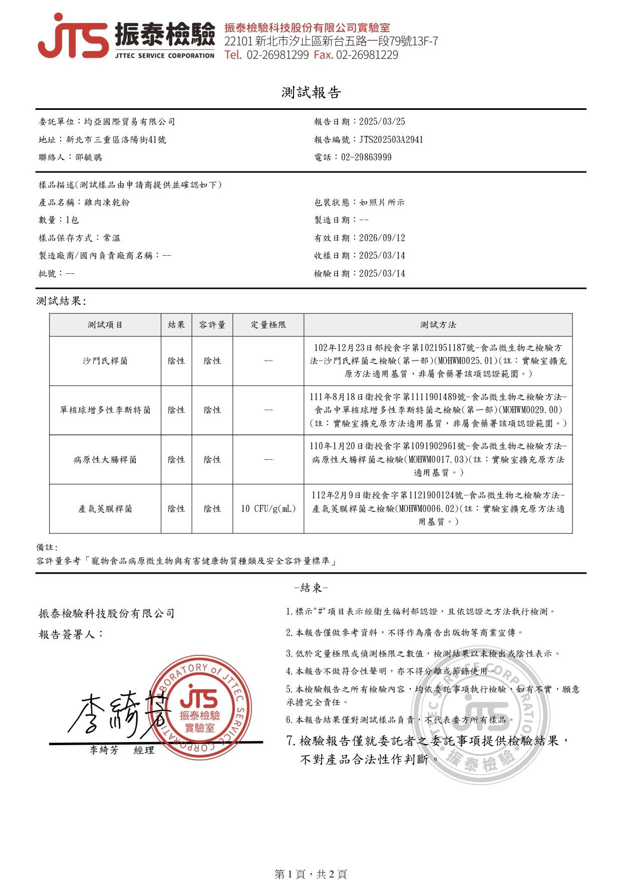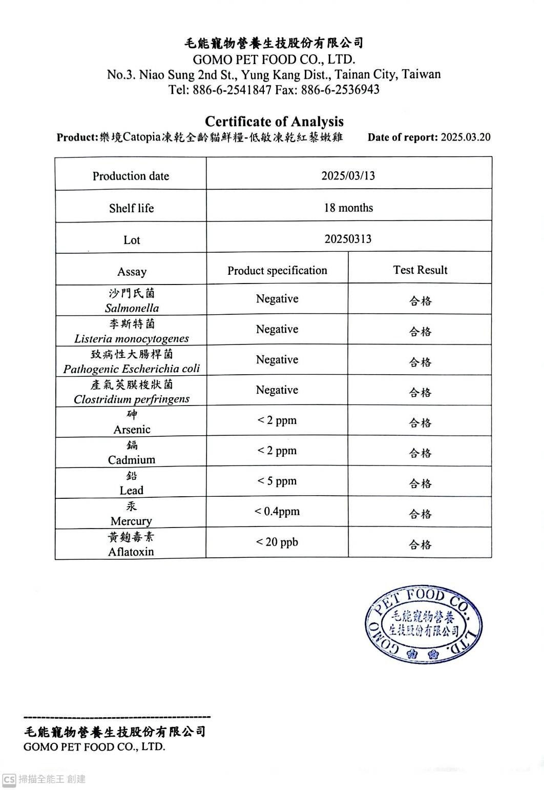 【檢驗報告】樂境凍乾全齡貓鮮糧-低敏凍乾紅藜嫩雞
